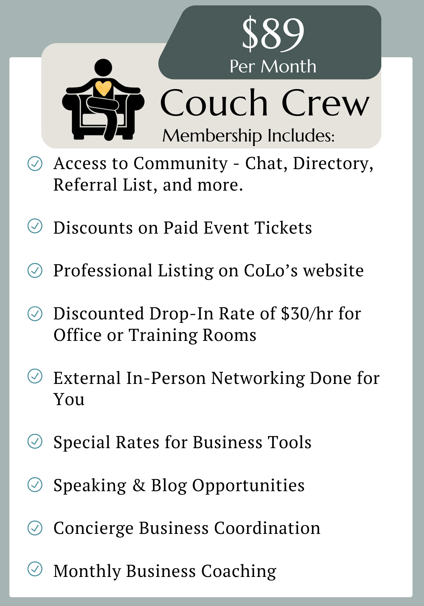 Our network starts with our base membership. Couch Crew is shaped by private practice clinicians' needs with meetups, business support, and business growth opportunities all to make private practice less private.
